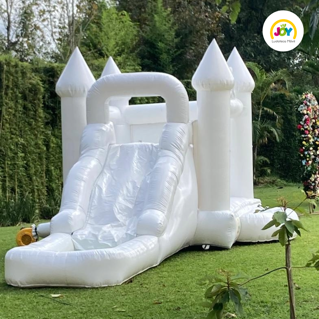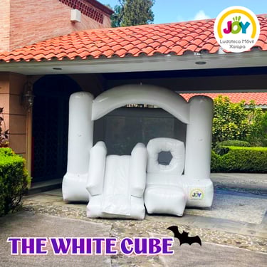 White Cube: Bello inflable con resbaladilla y mini tunel, puedes contratarlo con y sin decoración, en Set o individual. Se requiere un espacio de 5 x 4 para su instalación. ¡Lo podemos decorar con una girnalda de globos con temática de la fiesta!