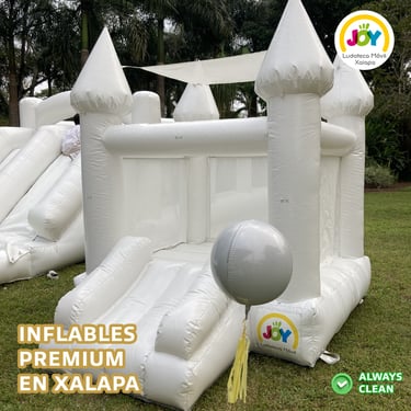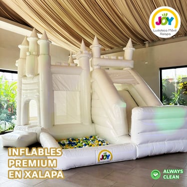 Castillo Deluxe: Un diseño único en Xalapa, es súper versátil, ideal para eventos formales como bautizos, bodas y primera comunión; fiestas infantiles o eventos sociales. Tiene brincolín, escalera, resbaladilla y alberca de pelotas. Mide 7 metros de largo por 4 de ancho. Además, lo podemos decorar con una girnalda de globos con la temática de la fiesta (costo extra).